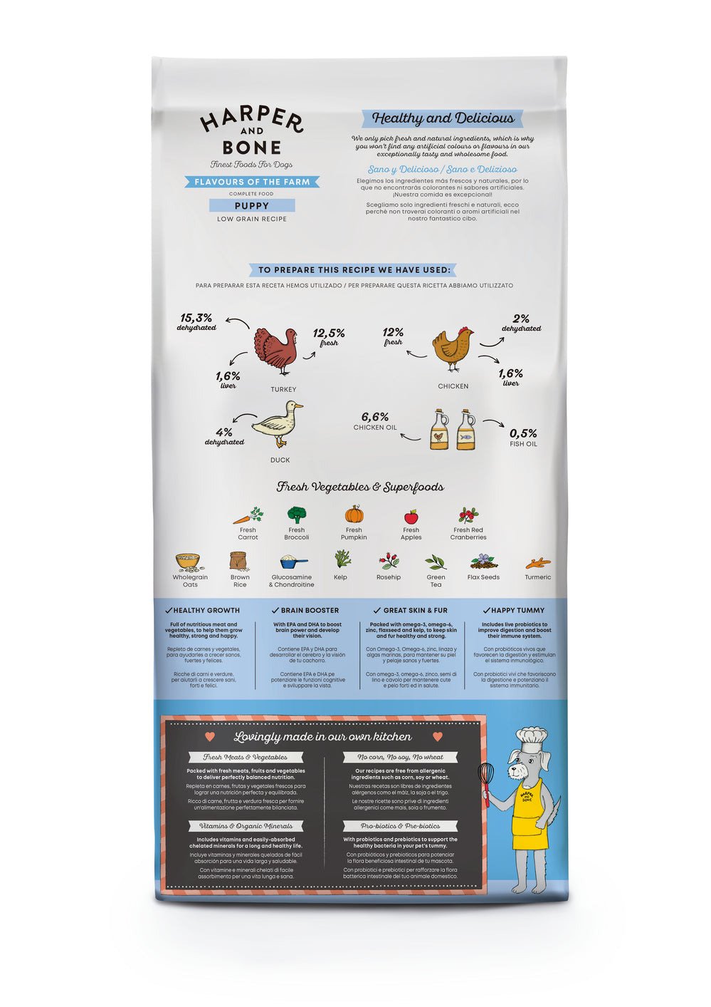 Este excelente y completo pienso seco para cachorros es una mezcla irresistiblemente sabrosa y repleta de proteínas que incluye pavo, pollo y pato de la mejor calidad, además de verduras y frutas enteras y deliciosamente frescas. En la mezcla hemos incorporado algunos de los maravillosos superalimentos que nos ofrece la naturaleza, así como probióticos saludables que favorecerán la digestión de tu cachorro. Nuestra receta no solo está llena de vitaminas y minerales esenciales, sino que además contiene condroitina y glucosamina para ayudar al buen estado de huesos y articulaciones. Todos estos factores combinados le proporcionarán a tu pequeño amigo cuadrúpedo una alimentación perfectamente equilibrada, ¡y sus deliciosos sabores de granja le harán mover la cola de alegría!