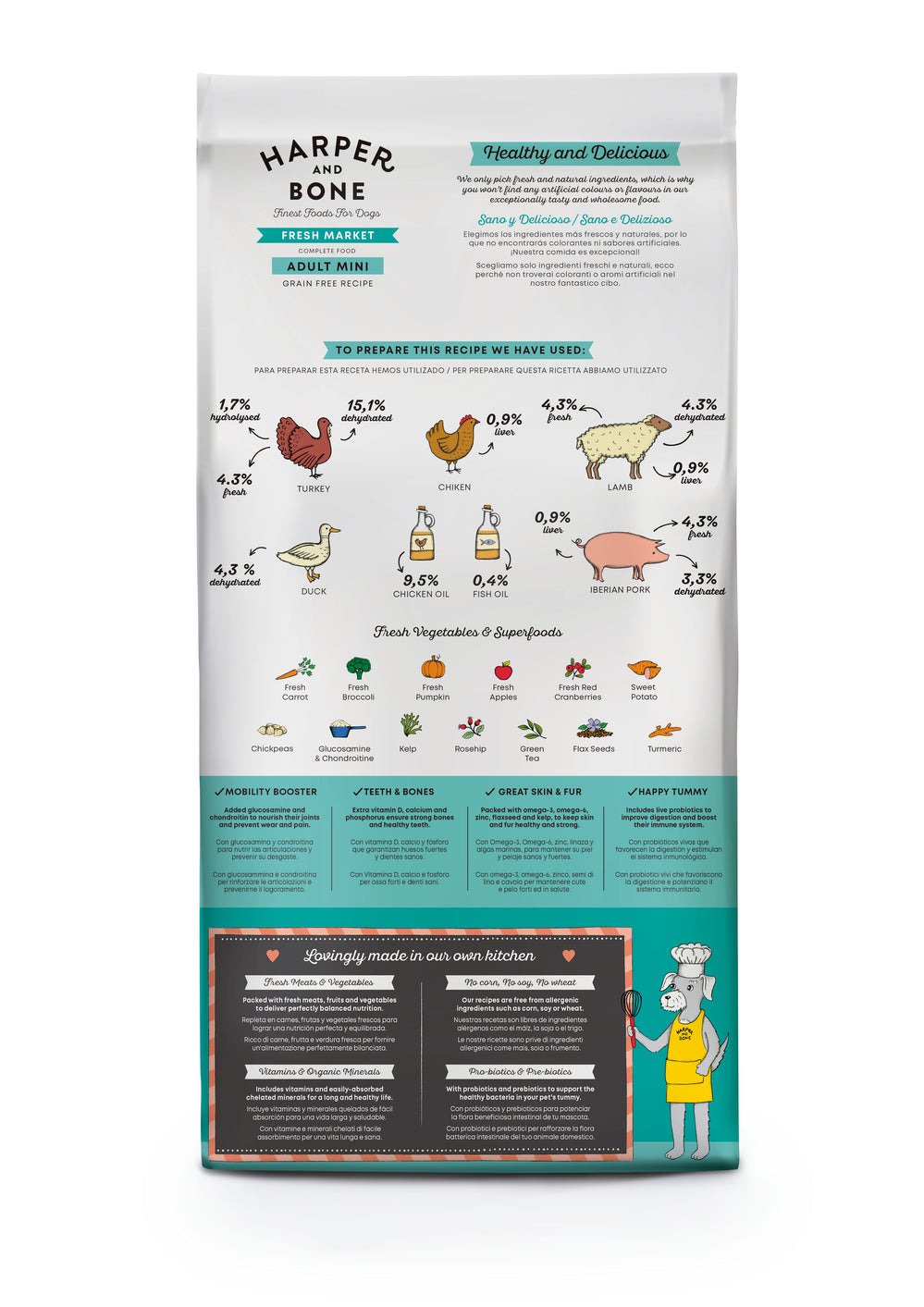 pavo deshidratado 15,1%, patata deshidratada, guisantes verdes enteros, aceite de pollo (protegido con tocoferoles naturales) 9,5%, pato deshidratado 4,3%, hígado de cordero preparado en fresco 4,3%, pavo deshuesado preparado en fresco 4,3%, cordero deshidratado 4,3%, garbanzos enteros 4,3%, cerdo ibérico deshuesado preparado en fresco 4,3%, fibra de manzana, pulpa de remolacha, cerdo ibérico deshidratado 3,3%, patata dulce deshidratada 2,6%, pavo hidrolizado 1,7%, hígado de cerdo hidrolizado 0,9%, hígado de cordero hidrolizado 0,9%, hígado de pollo hidrolizado 0,9%, semillas de lino (fuente natural de ácidos grasos ω3) 0,6%, aceite de pescado (protegido con tocoferoles naturales) 0,4%, levaduras (Saccharomyces cerevisiae), algarroba, minerales, brócoli fresco 1000 mg/kg, calabaza fresca 1000 mg/kg, manzanas frescas 1000 mg/kg, zanahorias frescas 1000 mg/kg, glucosamina 1000 mg/kg, condroitina 600 mg/kg, pared celular hidrolizada de levaduras (fuente de MOS) 500 mg/kg, achicoria (fuente de FOS) 500 mg/kg, extracto de mandarina 500 mg/kg, Yucca schidigera 200 mg/kg, alga kelp 30 mg/kg, arándanos rojos enteros 30 mg/kg, rosa canina (rica en vitamina C) 30 mg/kg, té verde 30 mg/kg, cúrcuma 30 mg/kg.