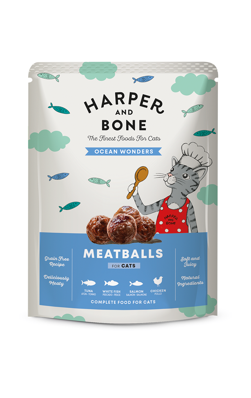 Nuestras deliciosas y suaves albóndigas sin cereales están preparadas con deliciosos cortes de carnes y pescados de altísima calidad, además de frutas y vegetales 100% frescos y naturales; son suaves, jugosas y deliciosas, y a tu gato le van a encantar. Cada bocado de las albóndigas Ocean Wonders de Harper & Bone contiene atún, merluza y salmón, además de patata fresca, guisantes y alga kelp, son ricas en proteínas y ácidos grasos omega 3 y 6; en conjunto proporcionarán una alimentación completa, nutritiva y exquisita para tu mejor amigo. Nuestras innovadoras recetas de albóndigas las elaboramos en nuestra propia cocina y se cocinan en sus propios jugos como si fueran para nosotros mismos. Es una receta casera que hemos llevado al mundo de la nutrición animal, ¡y vaya que ha valido la pena! El nivel de palatabilidad es máximo, y además de mimar a tu gato, él se beneficiará del gran aporte nutritivo. Así que, ¿por qué no darle a tu gato una comida que le hará mover la cola de alegría? ¡Con nuestras albóndigas Harper & Bone, tu gato estará feliz y tú también!