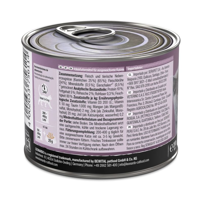 Composición Carnes y subproductos animales (conejo 25 %) (65 %); caldo de carne (34 %); minerales (0,5 %); cáscaras de huevo*¹ (0,5 %) *¹secado