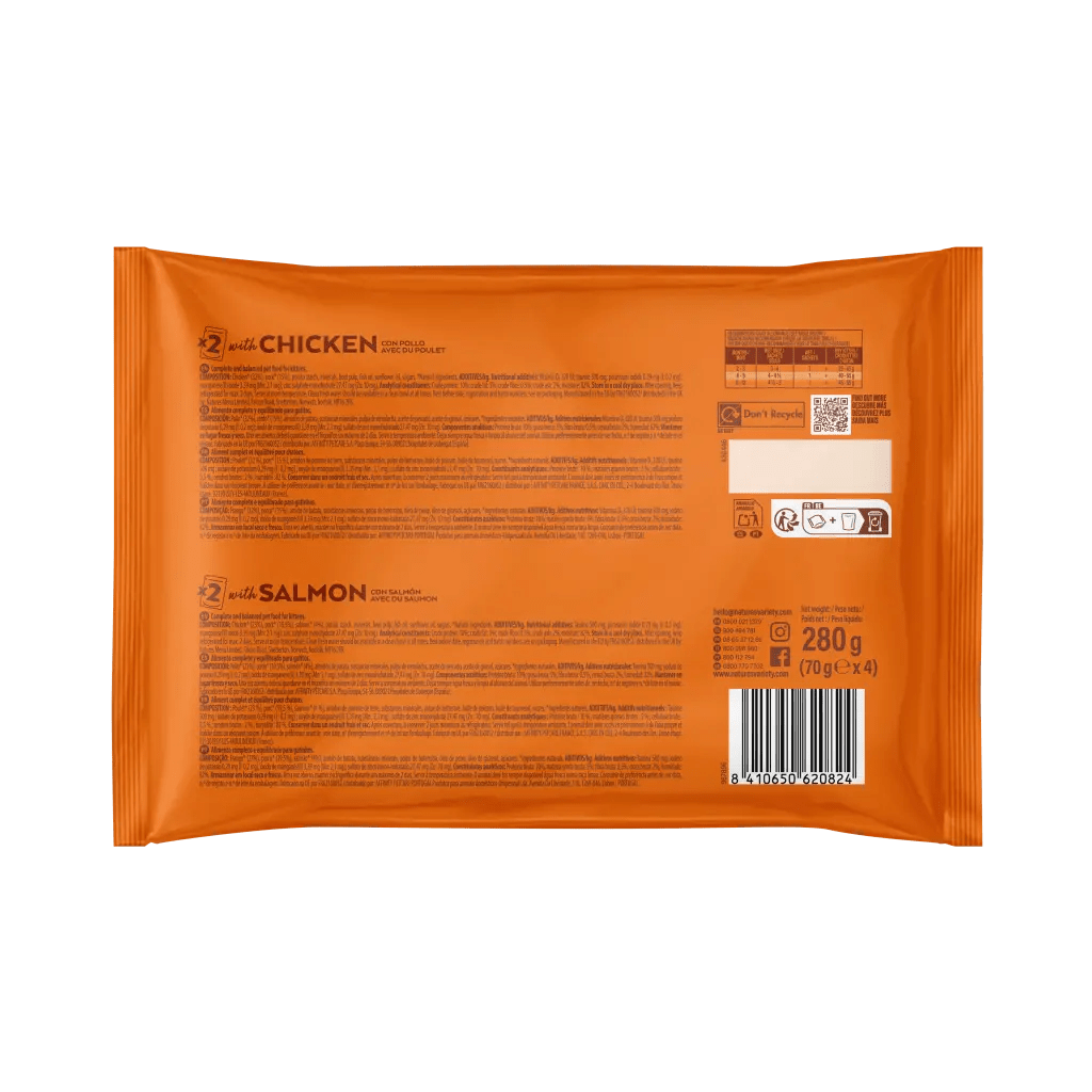 Bocaditos en salsa con pollo o salmón. Cocidos al vapor a temperatura óptima en su propio jugo para preservar mejor los nutrientes.